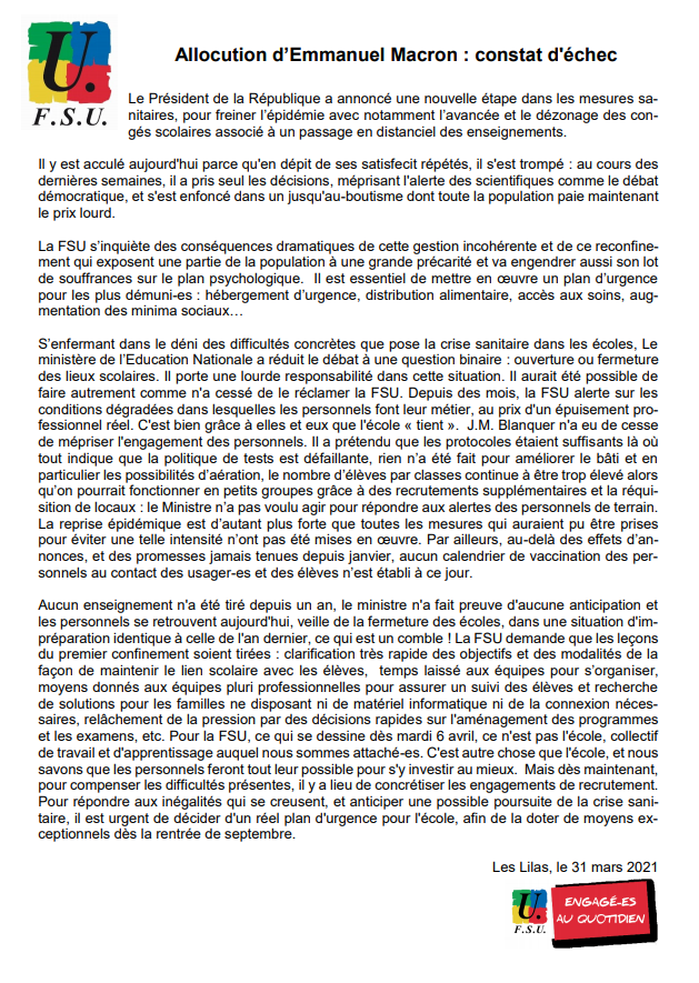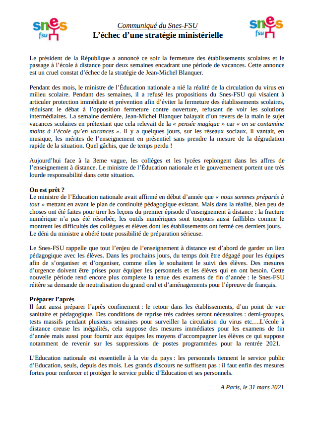 Ci-dessous, les communiqués du SNES-FSU et de la FSU suite aux annonces présidentielles