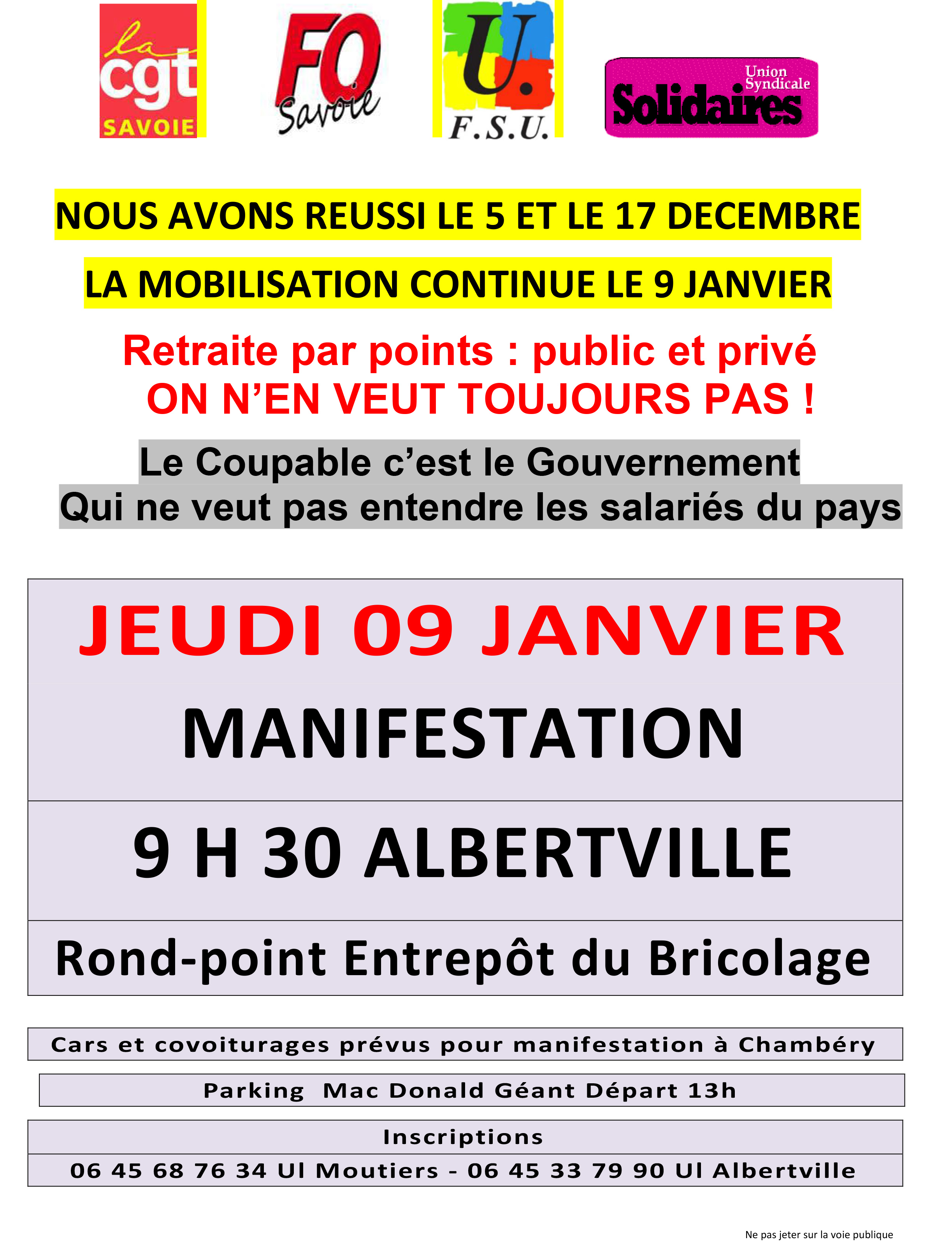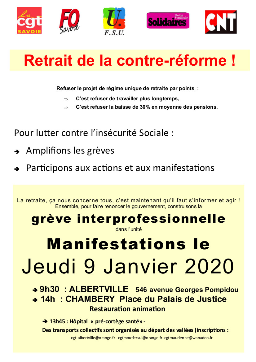 Vous êtes ici : Accueil Actualités Archives ACTIONS DU 9 JANVIER 4 janvier 2020 Sections départementales ACTIONS DU 9 JANVIER Imprimer l'article Cet article n'est probablement plus d'actualité L’intersydicale des Unions Locales du bassin Albertvillois s’est réunie et a décidé d’une action : 73_tract du 9janv2020 Tract de la manifestation organisée sur Chambéry : 73_tract2 du 9janv2020