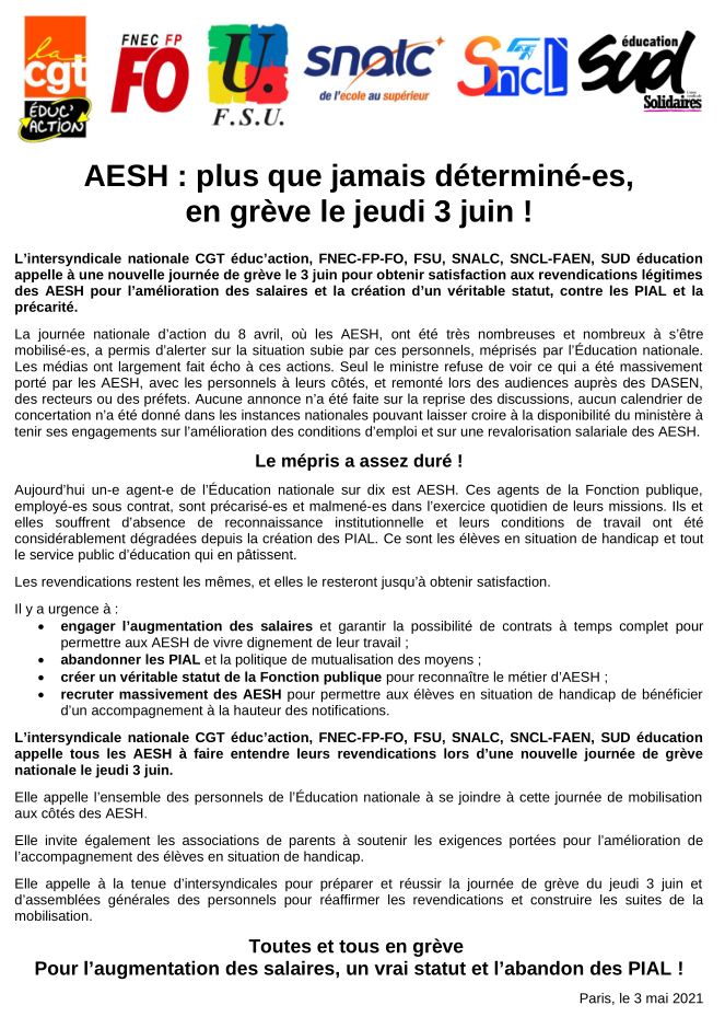 Le mépris pour ces personnels indispensables à l’inclusion des élèves à besoins particuliers a assez duré ! C’est pourquoi l’intersyndicale CGT, FO, FSU, SUD appelle tous les personnels à une journée de grève et d’action le jeudi 3 juin pour exiger :