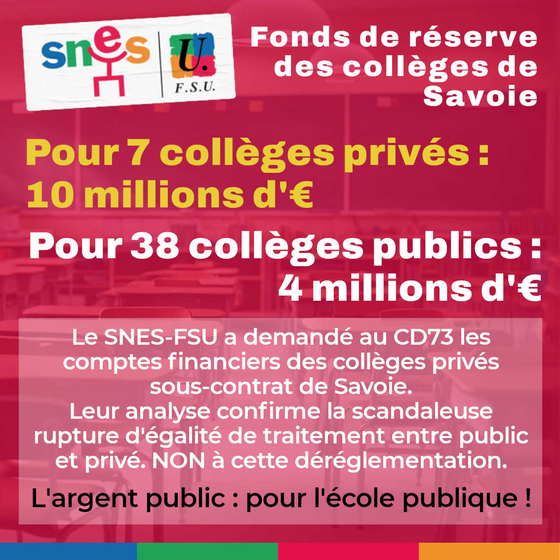 Suite à notre demande, le conseil départemental a fourni au SNES-FSU les comptes financiers des collèges privés de Savoie, et nous les avons analysé. Ce que nous y avons trouvé confirme l’énorme inégalité que nous dénonçons entre collèges publics et privés sous contrat.