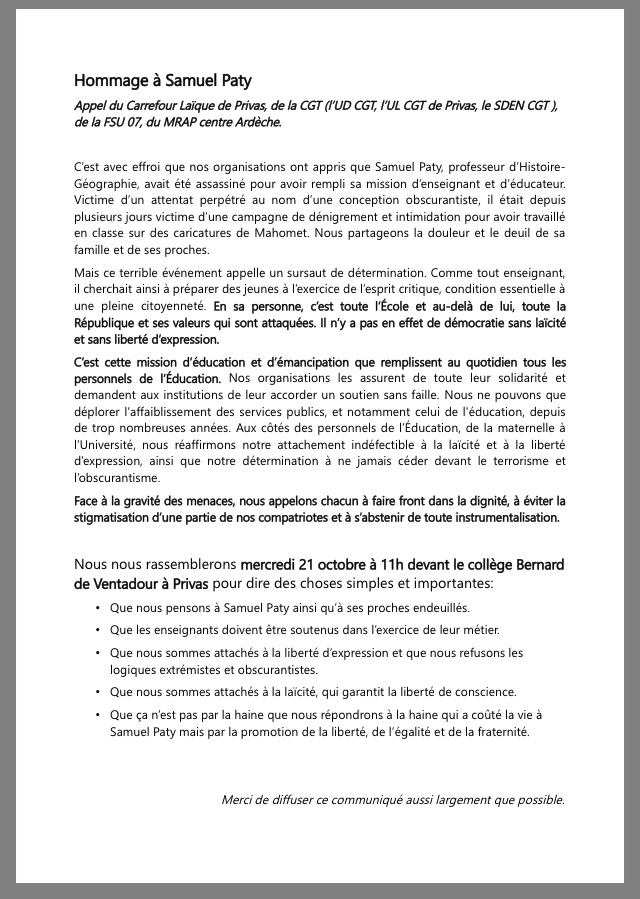 Nous joignons à ce communiqué l’hommage à Samuel Paty, lu devant le collège Ventadour de Privas, publié pour appeler à ce rassemblement au nom du MRAP centre Ardèche, du Carrefour laïque de Privas, de la FSU 07 et de la CGT 07, rédigé sur la base de la prise de parole intersyndicale du 18 octobre à Valence et d’un communiqué national intersyndical initié par SOS Racisme, la FSU, le Sgen-CFDT, l’Unsa Education, le SNALC, la FCPE, la FIDL, la FAGE, l’UEJF, « Dessinez Créez Liberté », la LDH et le MRAP, soutenu par Charlie Hebdo.