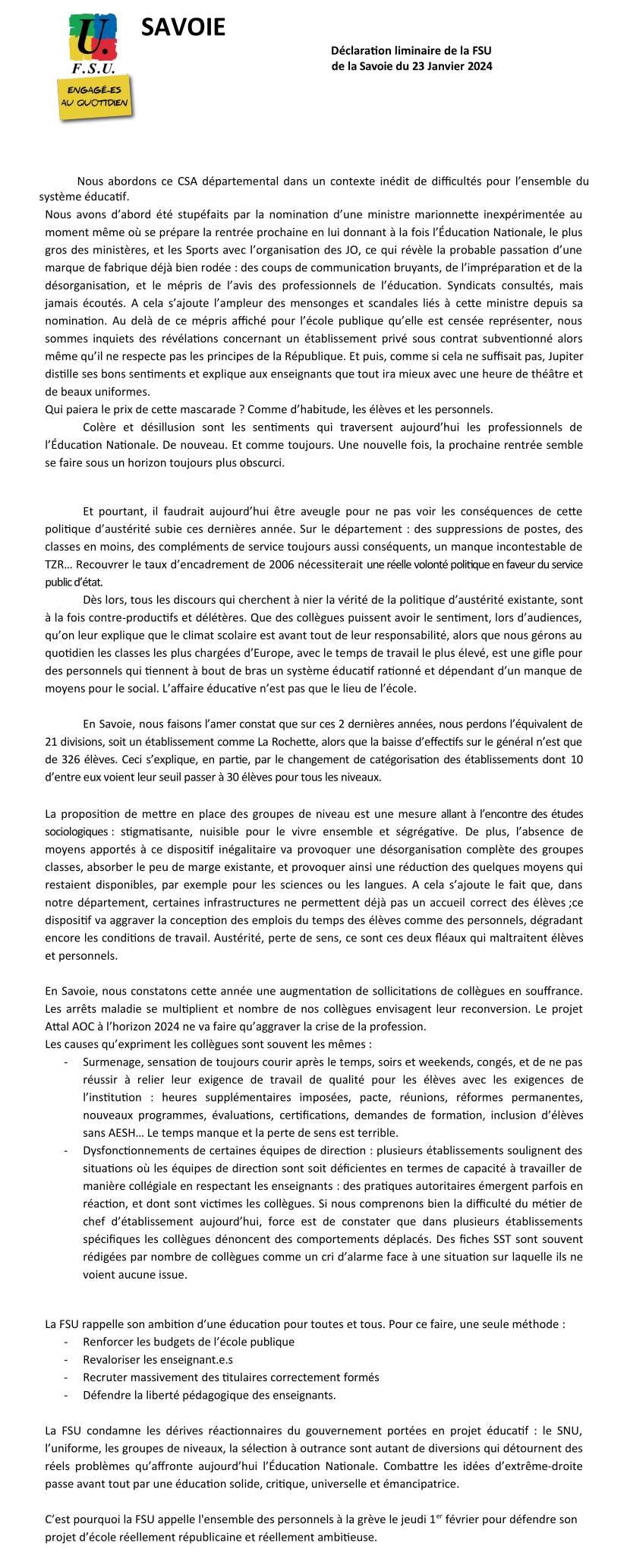 Vous êtes ici : Accueil Publications CSA départemental du 23 janvier - Déclaration liminaire 30 janvier 2024 Sections départementales CSA départemental du 23 janvier - Déclaration liminaire Imprimer l'article