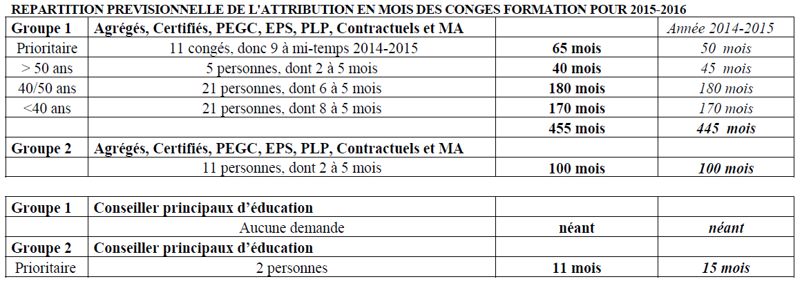 L’attribution des congés de formation pour l’année 2015-2016 se fait dans un contexte budgétaire similaire à celui de l’année dernière et qui reste insuffisant pour répondre aux demandes de nos collègues qui restent aussi nombreuses. Pour que ce droit à une année de congé formation soit réellement ouvert à chaque fonctionnaire au cours de sa carrière, il est nécessaire d’augmenter le contingent de congés pour le porter à 2,25 % de la masse salariale. Nous sommes conscients que cela représenterait une augmentation considérable des moyens actuels, mais en l’absence de cela, tout barème et tout dispositif de répartition de ces moyens consiste de fait à priver une majorité de collègues de l’exercice de ce droit.