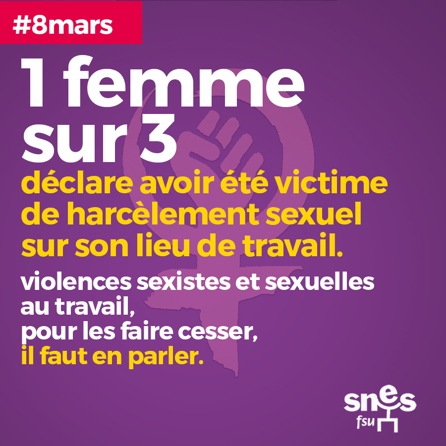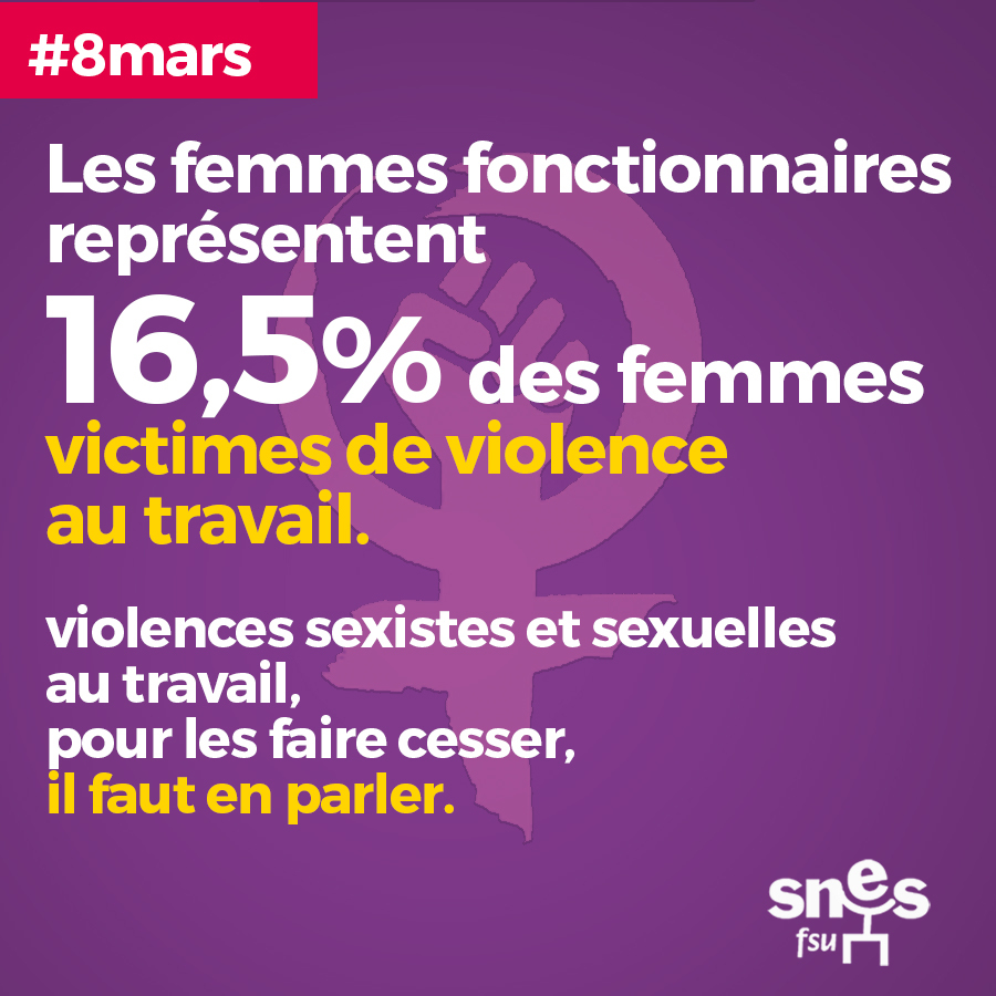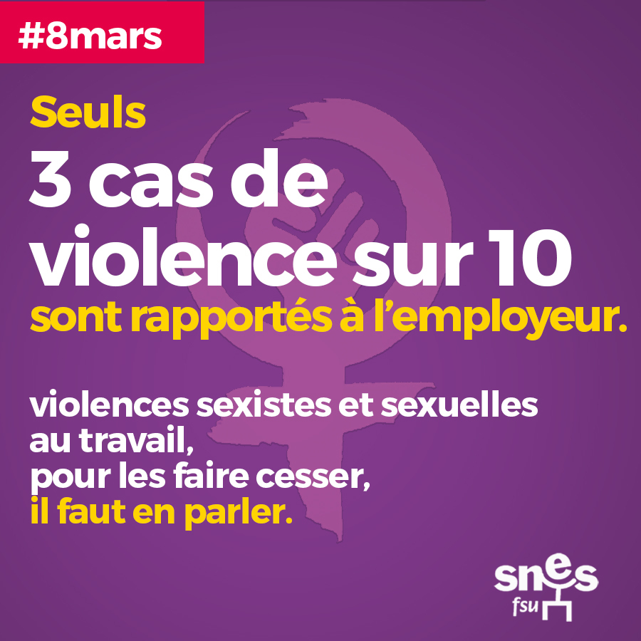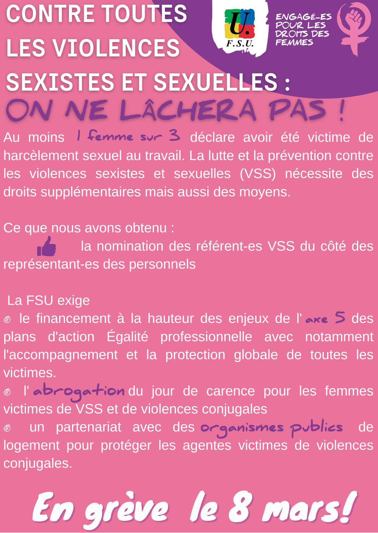 Les violences sexistes et sexuelles perdurent dramatiquement dans la société comme le révèle jour après jour le décompte des féminicides. La FSU dénonce le refus des employeurs publics d’assumer pleinement leurs devoirs d’accompagnement, d’orientation et de protection des victimes.