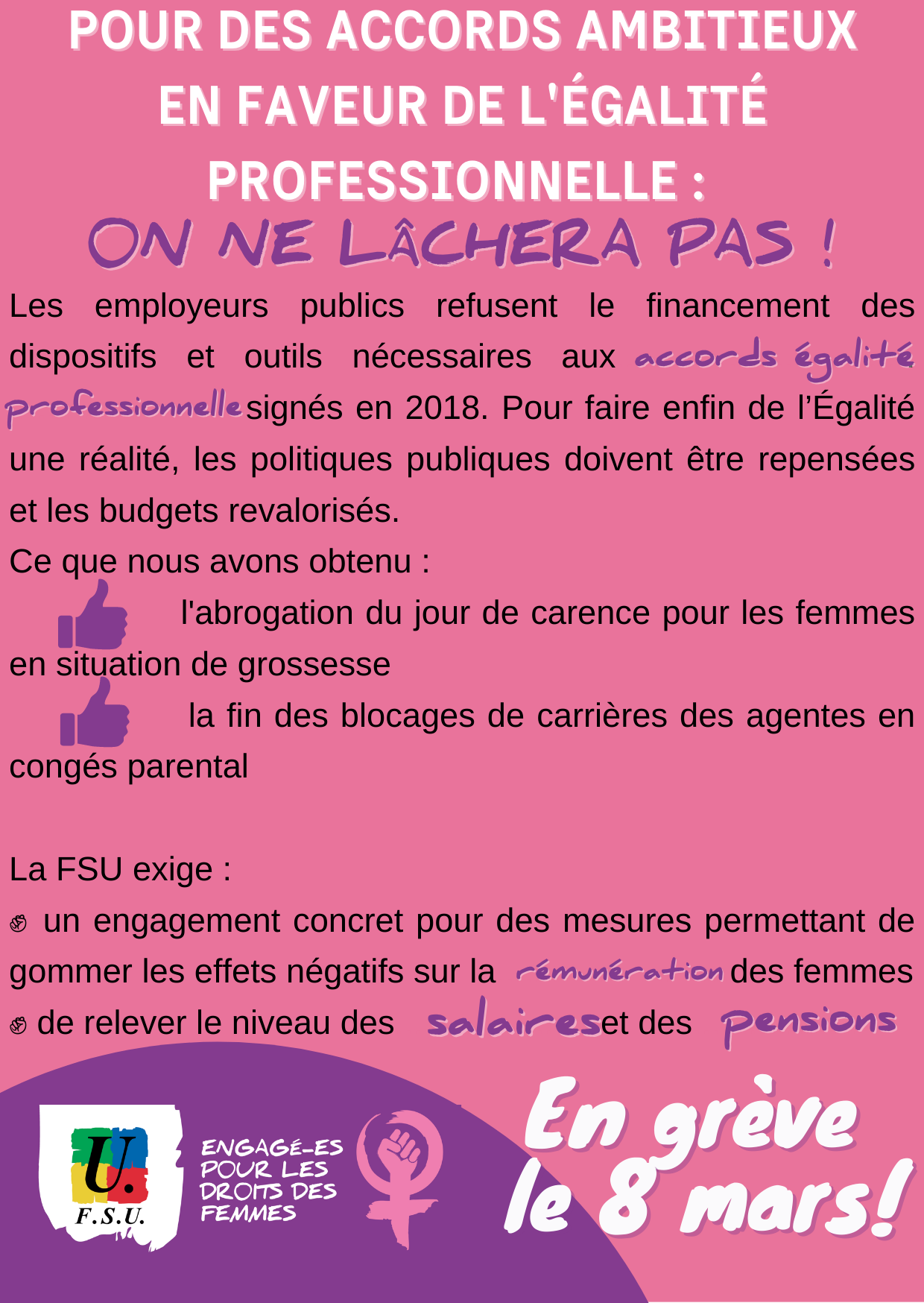 Dans les accords pour l’Egalité professionnelles entre les femmes et les hommes dans la fonction publique, la détermination des militant–es de la FSU a permis d’obtenir des avancées mais certaines ne sont toujours pas opérationnelles faute de volonté politique et de financement. Le gouvernement porte une vision performative des politiques d’égalité et ne s’attaque pas aux racines des inégalités.
