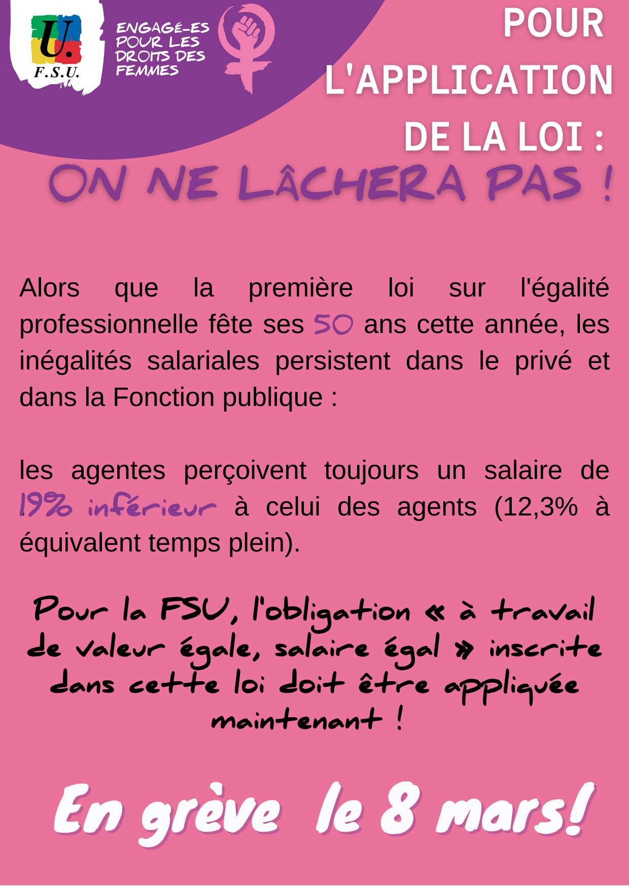 Alors que la 1ere loi sur l’égalité professionnelle qui impose « à travail de valeur égale, salaire égal » fête ses 50 ans, dans la fonction publique, 70% des agentes sont toujours sur les 10% d’emplois les moins rémunérés. La FSU exige des politiques publiques qu’elles s’attaquent réellement à la ségrégation professionnelle, aux parts variables de rémunération et au temps de travail.