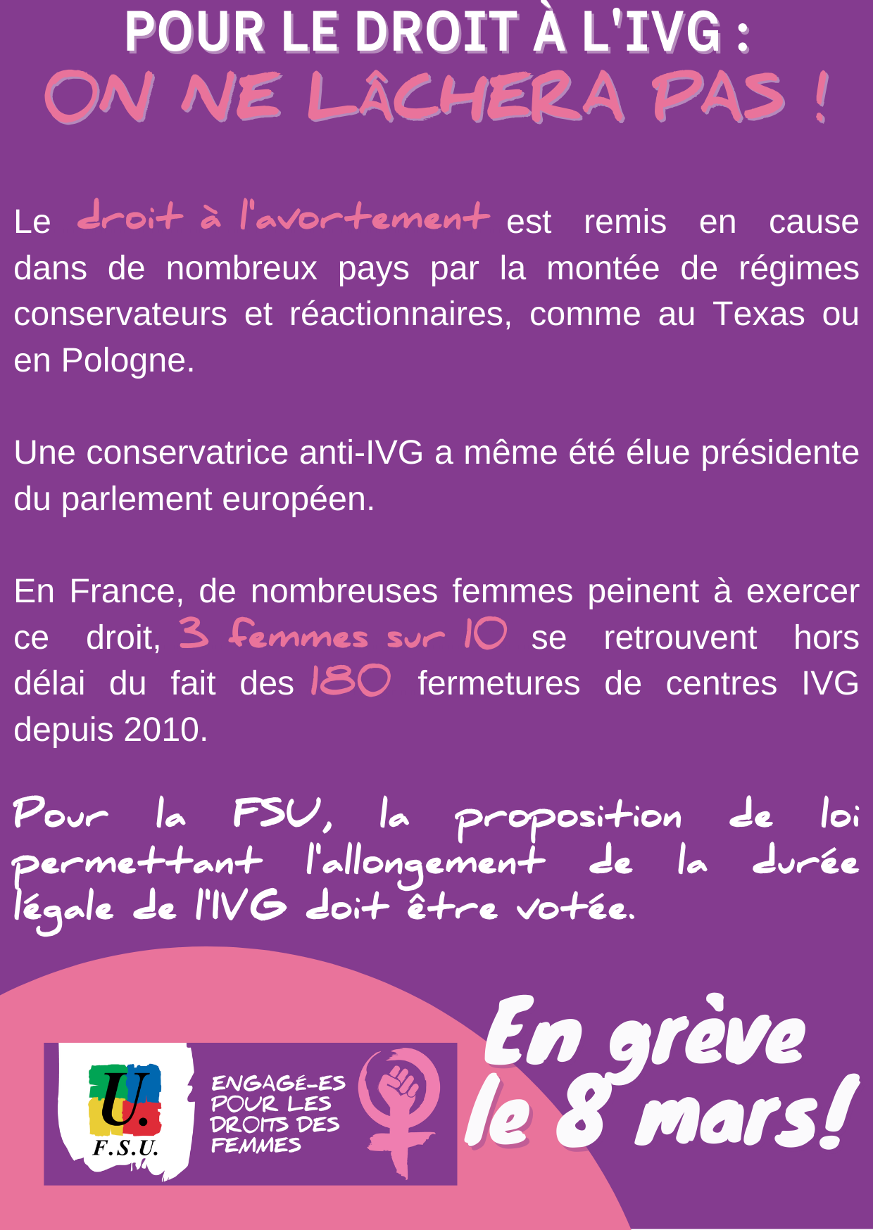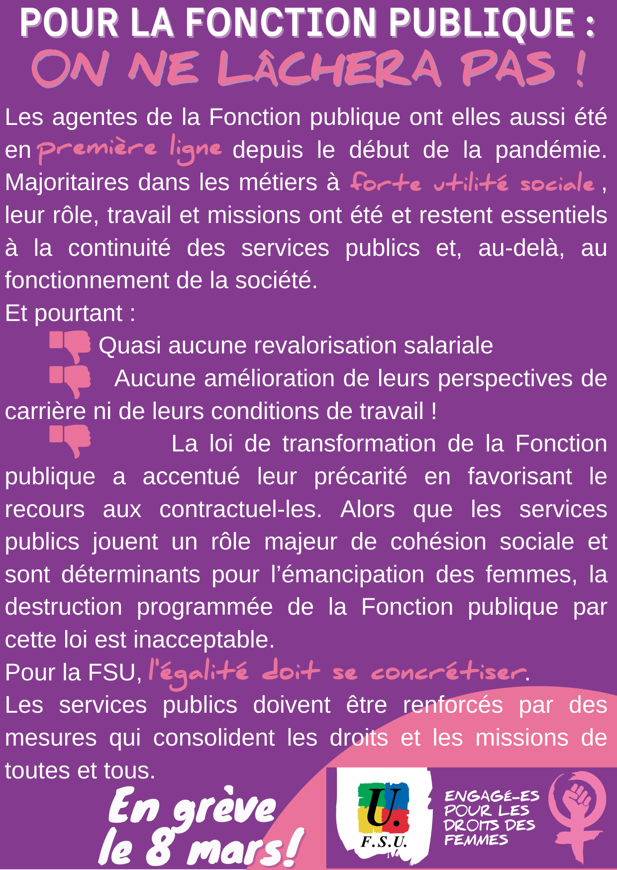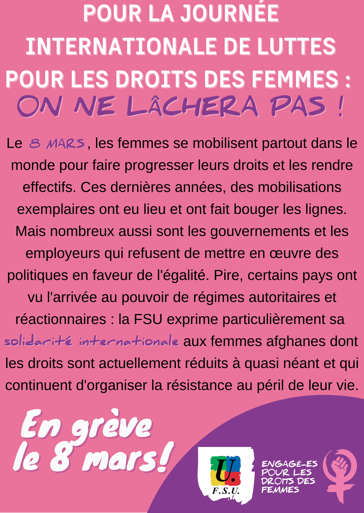En France, le 8 mars sera l’occasion de démontrer cette année encore le grand fossé entre les discours et les actes de ce gouvernement. Alors que c’était une grande cause du quinquennat, les inégalités salariales n’ont pas bougé, les agentes continuent de percevoir des salaires 19% inférieur dans la fonction publique. Dans cette période d’inflation galopante, sans mesures générales de revalorisation salariale, actives et retraitées vont en payer le prix fort. La FSU portera haut et fort l’urgence sociale que représente le dégel de la valeur du point d’indice mais aussi l’exigence de mesures ambitieuses en faveur de l’égalité professionnelle femmes/hommes.