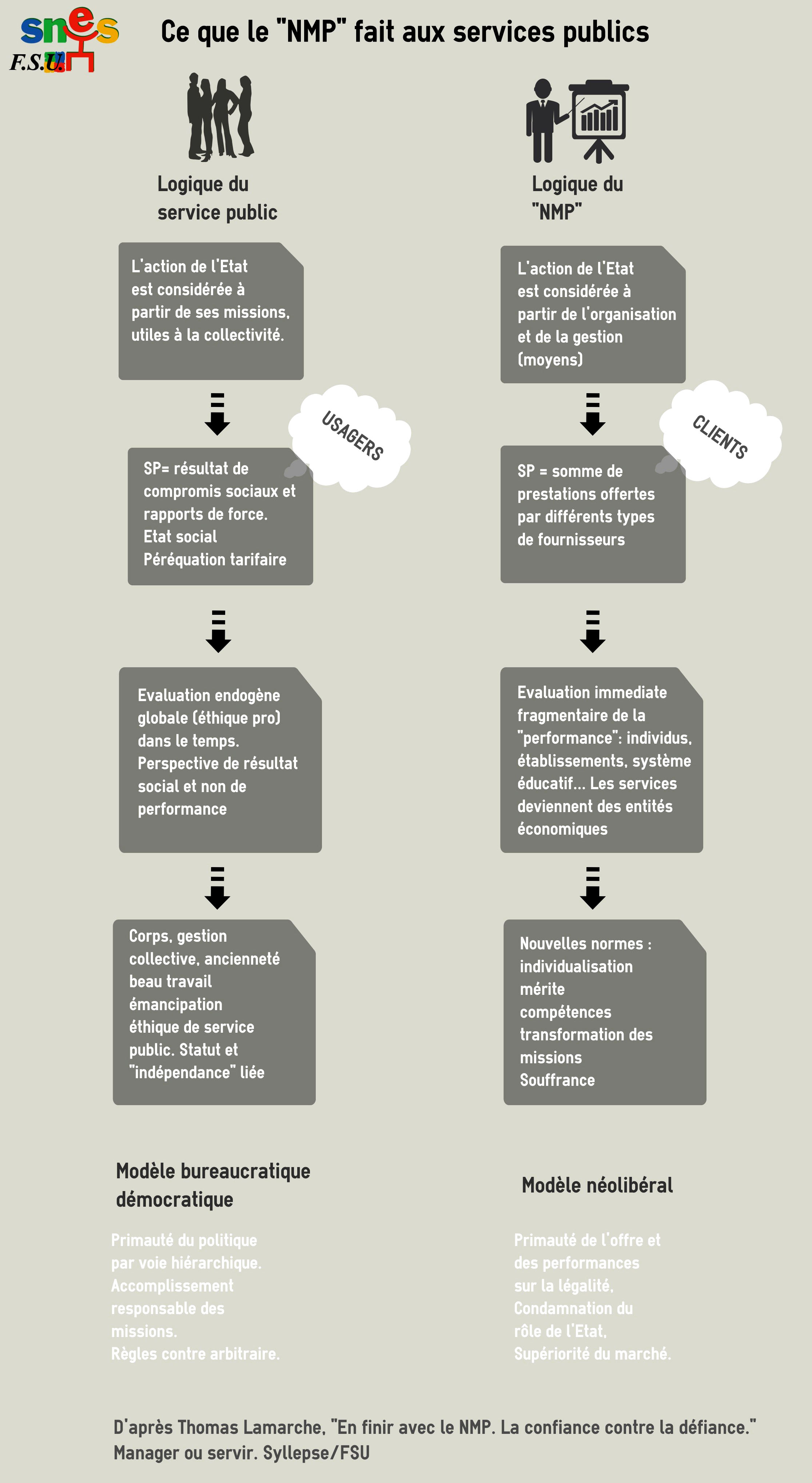 Le NPM, dont l’auto-évaluation participe, impose un contrôle « ex post » fondé sur le contrôle des résultats, des coûts, de l’ « efficience » (Puisque le gouvernement supprime les Psy-EN, avez-vous bien pris part à l’orientation des élèves même si ce n’est pas votre métier ?).