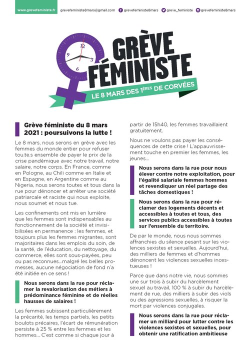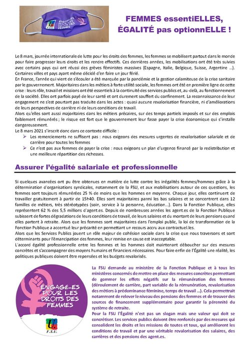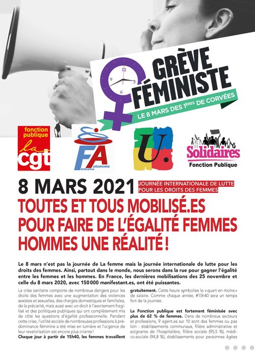 Le 8 mars, à l’occasion de la journée internationale de lutte pour les droits des femmes, tous les personnels sont appelés à se mobiliser et à participer aux actions organisées dans les territoires sous toutes ces formes (grève, rassemblements, manifestations, débrayage).