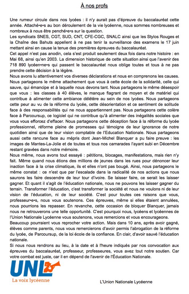 L’UNL, premier syndicat lycéen, soutient la mobilisation :