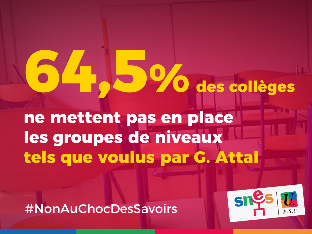 Le SNES-FSU a interrogé ses représentantes dans les collèges et leurs retours de terrain sont clairs : au 11 septembre, 64,5% des collèges ne mettent pas en place les groupes de niveaux tels que voulus par Gabriel Attal et 35,5 % des collèges appliquent complètement les groupes de niveaux (sur toutes les classes des niveaux concernés) (...).