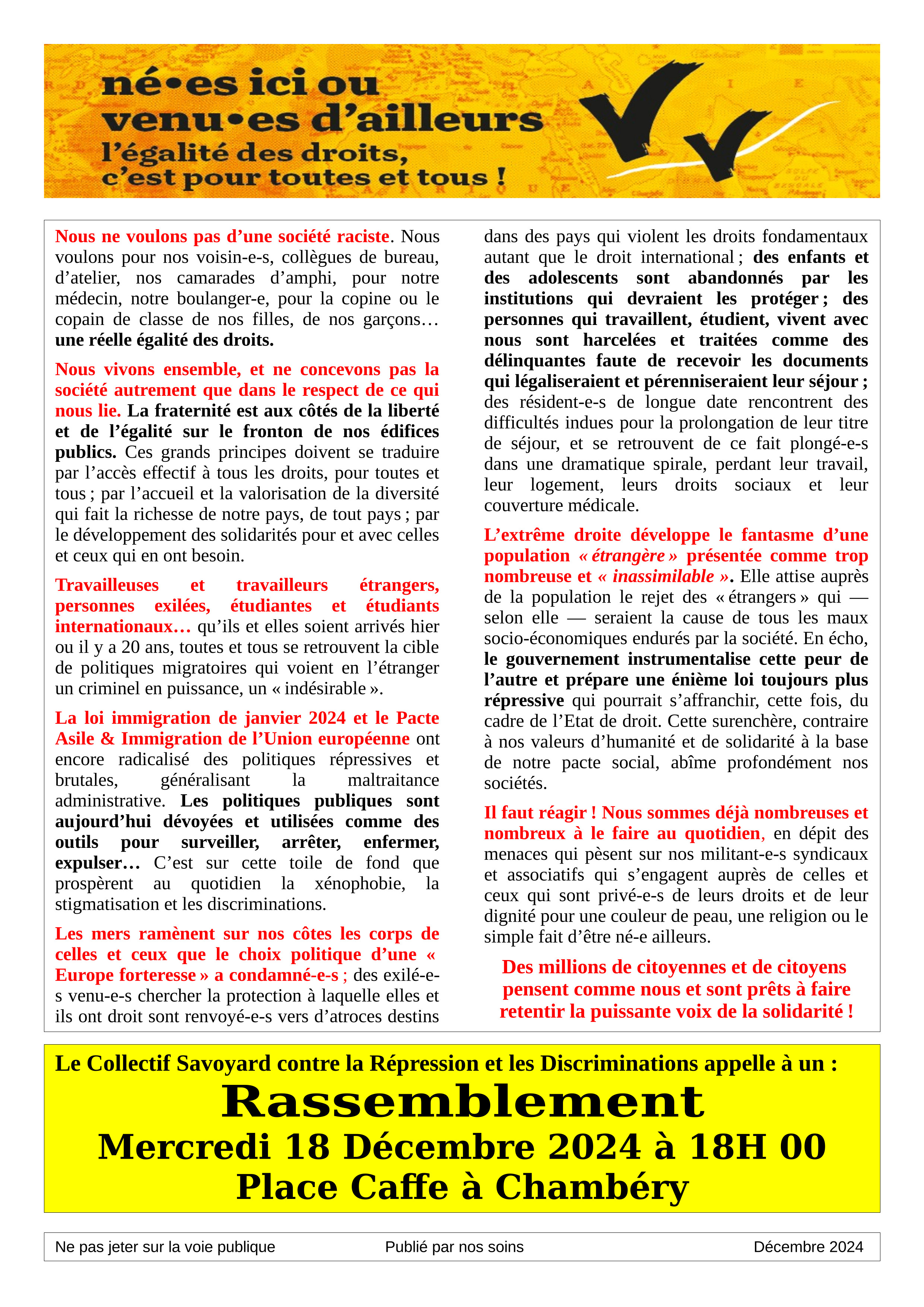 Vous êtes ici : Accueil Actualités Journée internationale des migrant·es 18 décembre 13 décembre 2024 Sections départementales Journée internationale des migrant·es 18 décembre Imprimer l'article Le Collectif Savoyard contre la Répression et les Discriminations appelle à un rassemblement Mercredi 18 Décembre 2024 à 18H 00 Place Caffe à Chambéry Journée internationale des migrant·es, tract départemental :