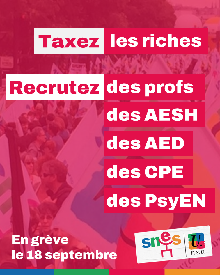 C’est maintenant la grève interprofessionnelle du jeudi 18 septembre qui se profile. Toutes les organisations syndicales appellent à la grève et aux manifestations. François Bayrou n’est plus premier ministre, mais c’est bien l’orientation des politiques menées qu’il faut changer ! Une rupture budgétaire évidente avec les politiques qui ont asphyxiés les services publics, en particulier le l’Education nationale, notamment le 2d degré. Il faut aussi un nouvelle orientation en matière de politique éducative : en finir avec les réformes de tri social (Choc des savoirs, ParcourSup, lycée Blanquer), revaloriser les personnels, améliorer les conditions de travail, conforter les personnels dans leurs métiers (à rebours des orientations sécuritaires données aux missions des CPE et AED ou du glissement vers des missions de santé pour les PsyEN) et obtenir un statut de fonctionnaires pour les AESH.