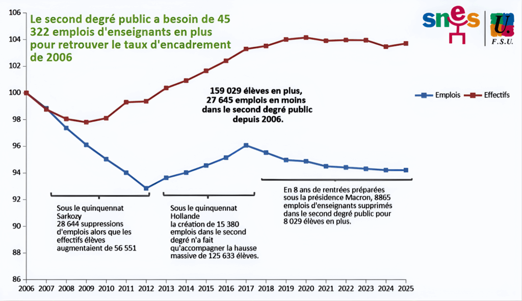 En 8 ans de rentrée préparées par Emmanuel Macron, le nombre d’élèves a augmenté dans les collèges et les lycées (+8865). Dans le même temps, les ministres successifs ont supprimé 8029 emplois de professeurs dans le 2d degré. L’argument démographique a bon dos, il est surtout un prétexte à légitimer encore des suppressions d’emplois !