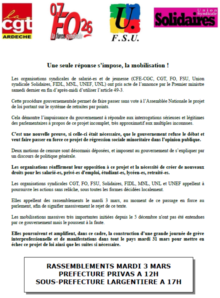 Vous êtes ici : Accueil Actualités Archives Le 49.3, c’est non ! Manifestations en Ardèche le 3 mars 2 mars 2020 Sections départementales Le 49.3, c’est non ! Manifestations en Ardèche le 3 mars Imprimer l'article Cet article n'est probablement plus d'actualité Face au passage en force du gouvernement, manifestons massivement notre refus du 49.3 et de la réforme des retraites. Défendons la démocratie ! Rendez-vous le mardi 3 mars : Privas : 12H, préfecture Largentière : 17h, sous-préfecture