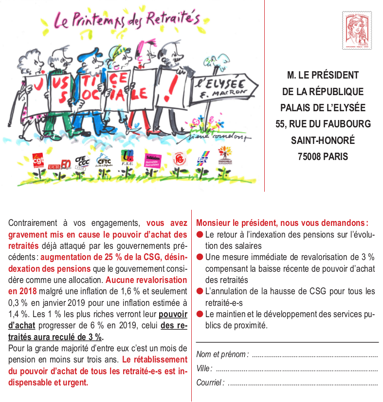 Vous êtes ici : Accueil Actualités Archives LE PRINTEMPS DES RETRAITES - LA CARTE POSTALE ! 3 avril 2019 Sections départementales LE PRINTEMPS DES RETRAITES - LA CARTE POSTALE ! Imprimer l'article Cet article n'est probablement plus d'actualité CARTE POSTALE VERSION PDF