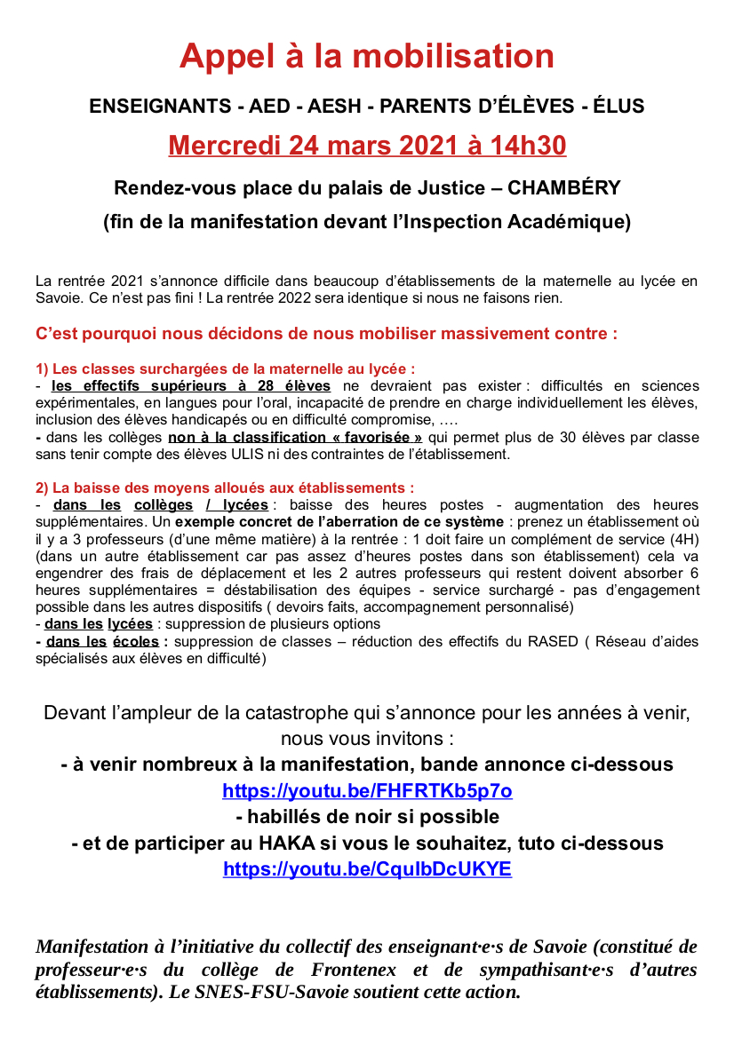Vous êtes ici : Accueil Actualités Archives Manifestation - Mercredi 24 Mars 14h30 - Chambéry - Palais de Justice 18 mars 2021 Sections départementales Manifestation - Mercredi 24 Mars 14h30 - Chambéry - Palais de Justice Imprimer l'article Cet article n'est probablement plus d'actualité VERSION PDF