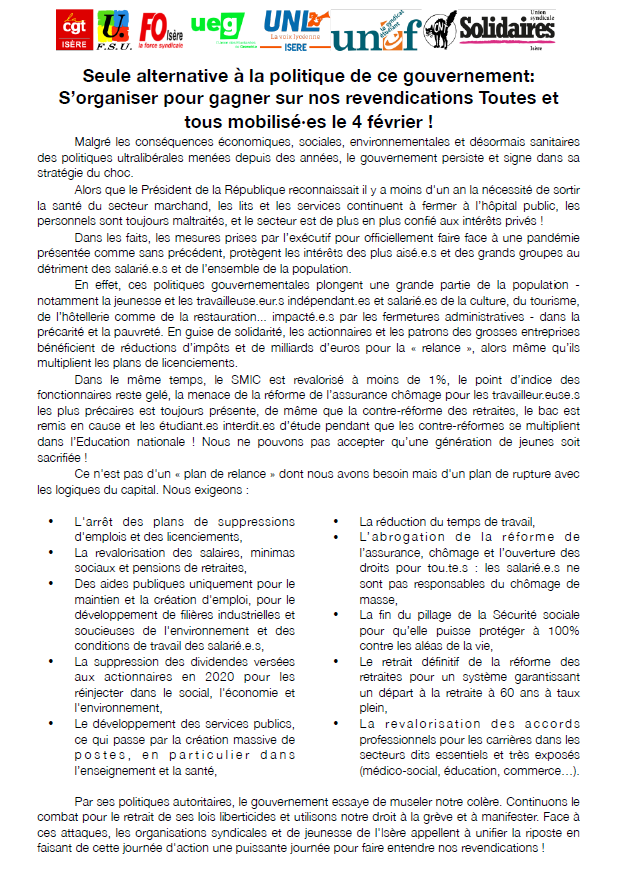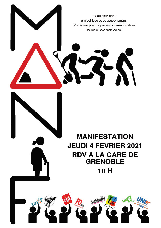 Vous êtes ici : Accueil Actualités Archives Mobilisation interprofessionnelle jeudi 4 février 28 janvier 2021 Sections départementales Mobilisation interprofessionnelle jeudi 4 février Imprimer l'article Cet article n'est probablement plus d'actualité Jeudi 4 février, mobilisation interprofessionnelle, manifestation à 10h à la gare de Grenoble Le tract