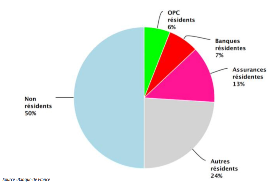 La moitié environ de la dette publique français est détenue par des investisseurs « non-résidents », individuellement ou dans des organismes de placements collectifs (OPC). Cela suffirait à démontrer aux oiseaux de mauvais augures que la dette publique française constitue une valeur digne de confiance, n’en déplaise aux « agences de notation », expertes autoproclamées, dignes des « milieux autorisés » de Coluche et dont les avis fleurent bon l’andouillette qui, elle, compte deux « A » de plus.