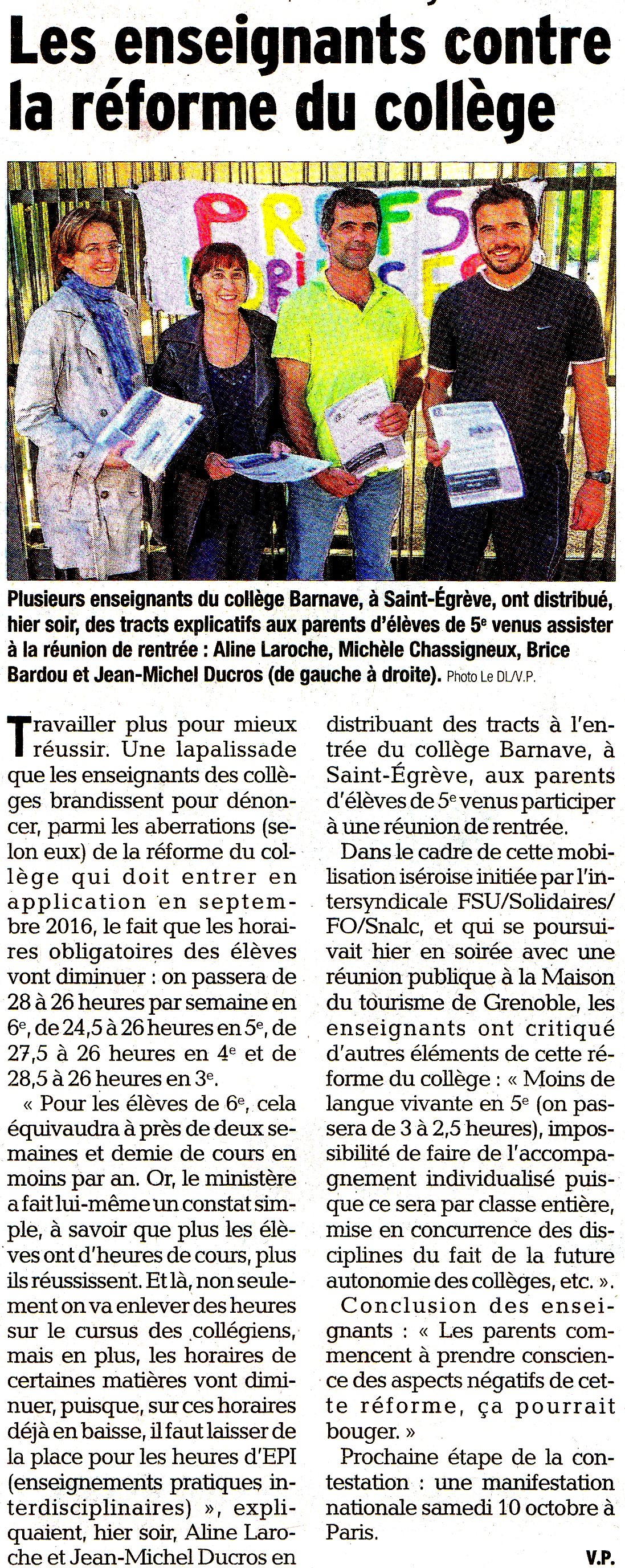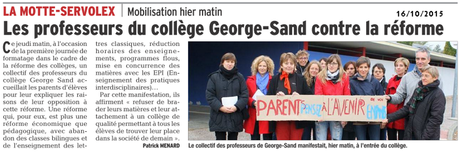 Jeudi 1, nous avons eu au collège … la journée d’information ou de publicité sur la réforme avec inspecteurs et formateurs. Trois collègues ont été désignés par la direction. Pendant ce temps les autres ont placé sur la voie publique des pancartes, banderoles, distribution de tracts avec l’aide des parents. Une pétition contre cette réforme a été donnée aux I.P.R.