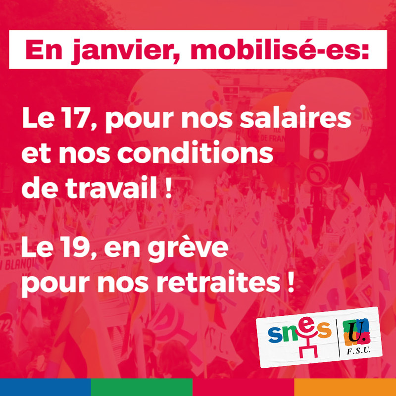 Le SNES et la FSU agissent et mobilisent pour combattre la dégradation annoncée du service public d’Éducation, mais aussi au sein de l’interpro pour gagner sur les retraites. Pour cela, dès la semaine prochaine, nous proposons d’organiser plusieurs temps forts de mobilisation afin de réunir les conditions pour gagner sur nos revendications salariales et obtenir l’abandon de cette réforme des retraites.