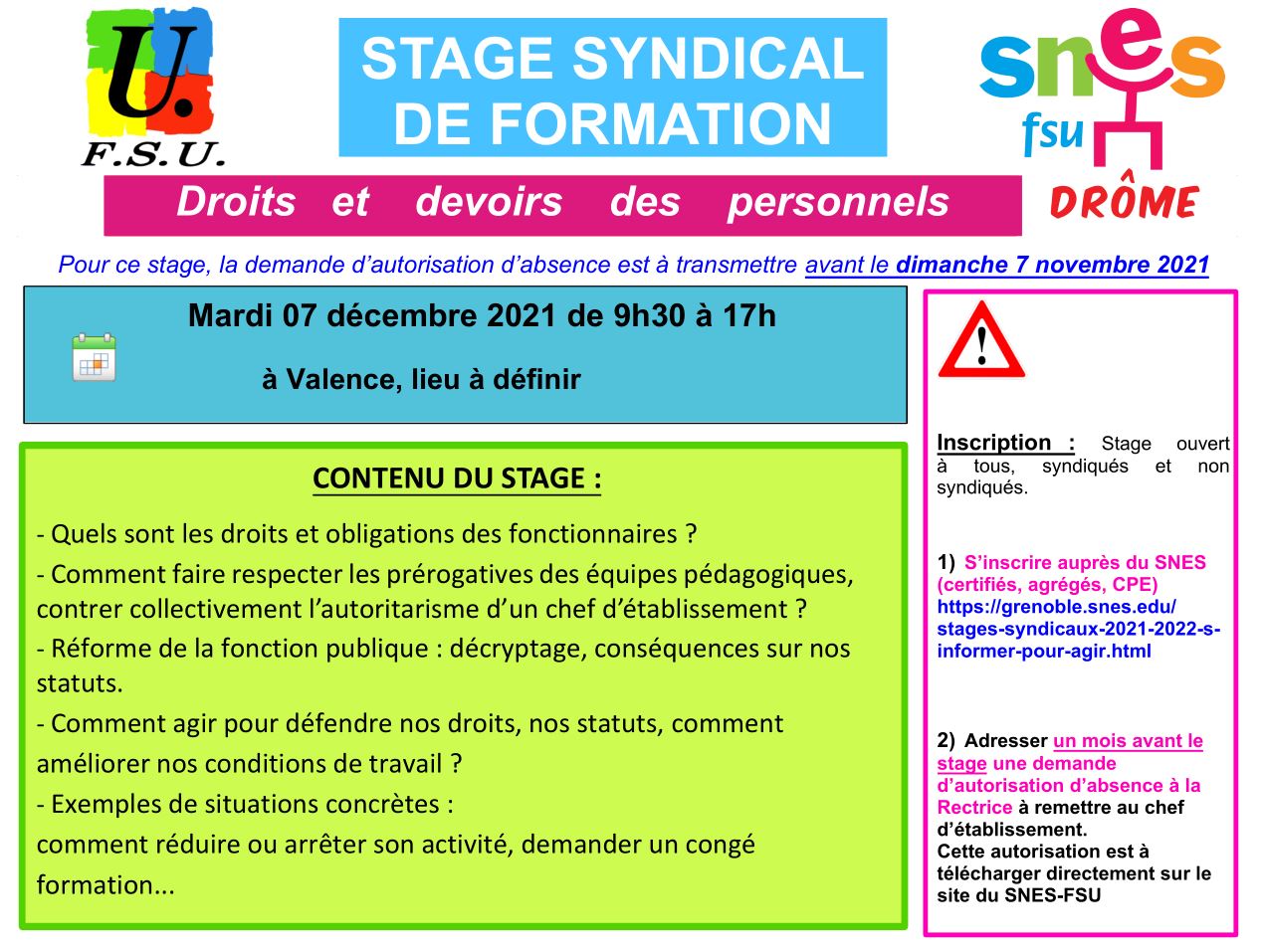 Proposé par la section académique du SNES-FSU en lien avec la section drômoise, le stage « Droits et devoir des personnels » organisé à Valence mardi 7 décembre.