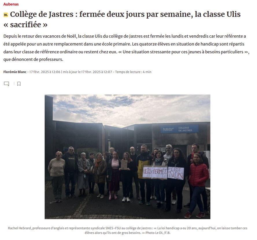 Depuis début janvier, le collège de Jastres fonctionne (quasiment) sans dispositif ULIS, au détriment des élèves, des familles et des personnels.