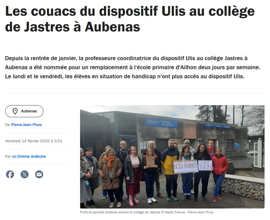 Le DASEN de l’Ardèche se verrait déjà généraliser les ULIS à tous les collèges. Mais la fermeture partielle de l’ULIS de Jastres pour envoyer l’enseignante spécialisée faire des remplacements dans une autre commune montre bien à quel point ces dispositifs nécessaires sont sacrifiés. Peut importe que cette décision sape la stabilité dont ces élèves ont besoin, que l’absence de sas de décompression mette à mal l’inclusion en classe ordinaire en générant de la souffrance pour les élèves et les personnels sans solution.