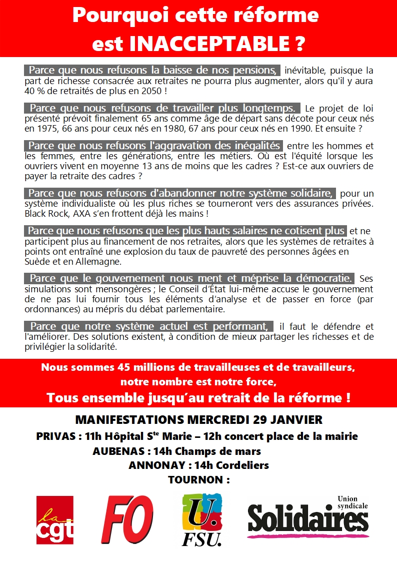 « Les organisations syndicales CGT, FO, FSU, Solidaires, FIDL, MNL, UNL et UNEF appellent à faire du mercredi 29 janvier, veille de la conférence de financement, une journée massive de grève et de manifestations interprofessionnelles et intergénérationnelles. »